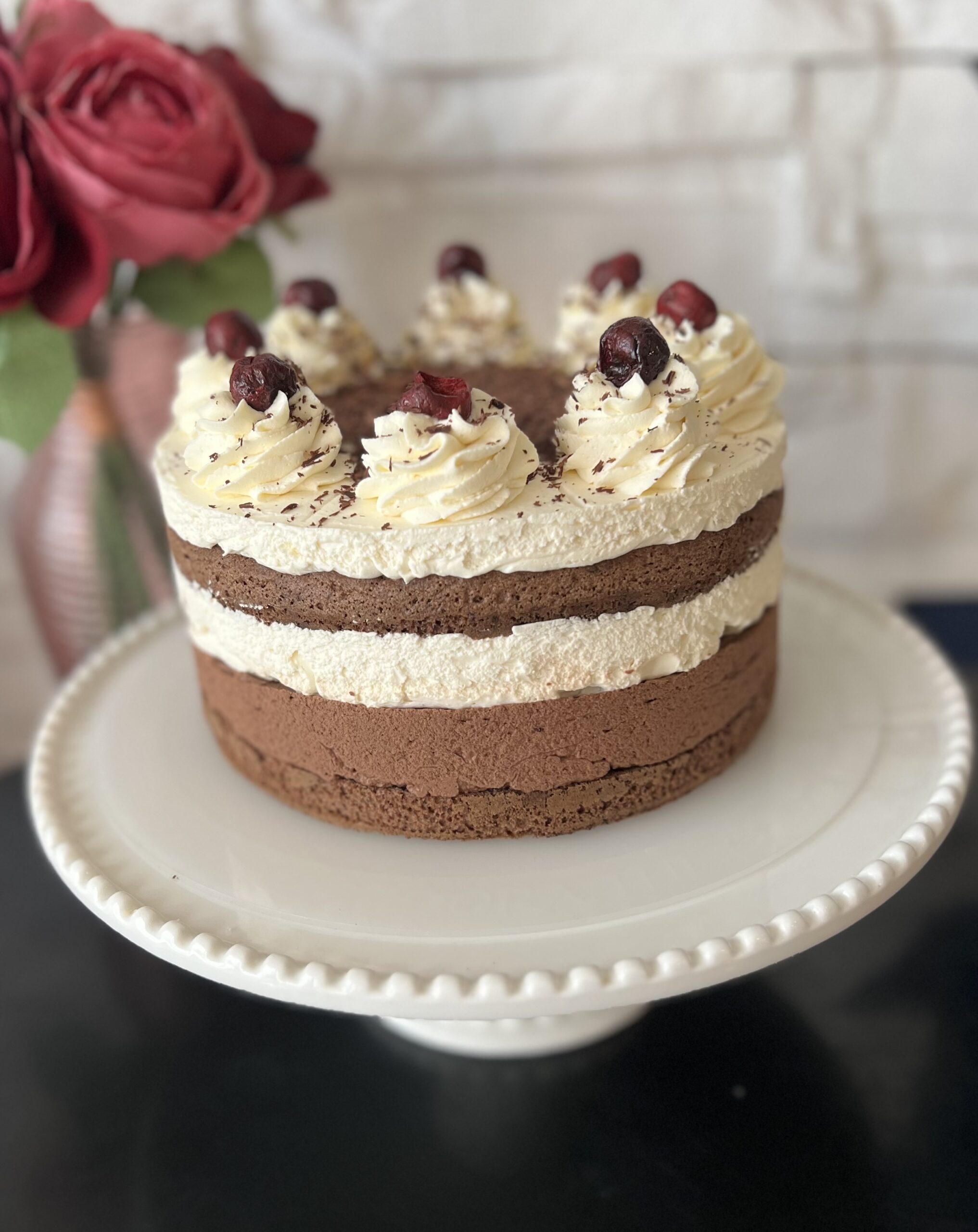czekoladowy biszkopt w towarzystwie pysznego musu czekoladowego i kremu śmietankowego, przełożonego kwaśną frużeliną wiśniową