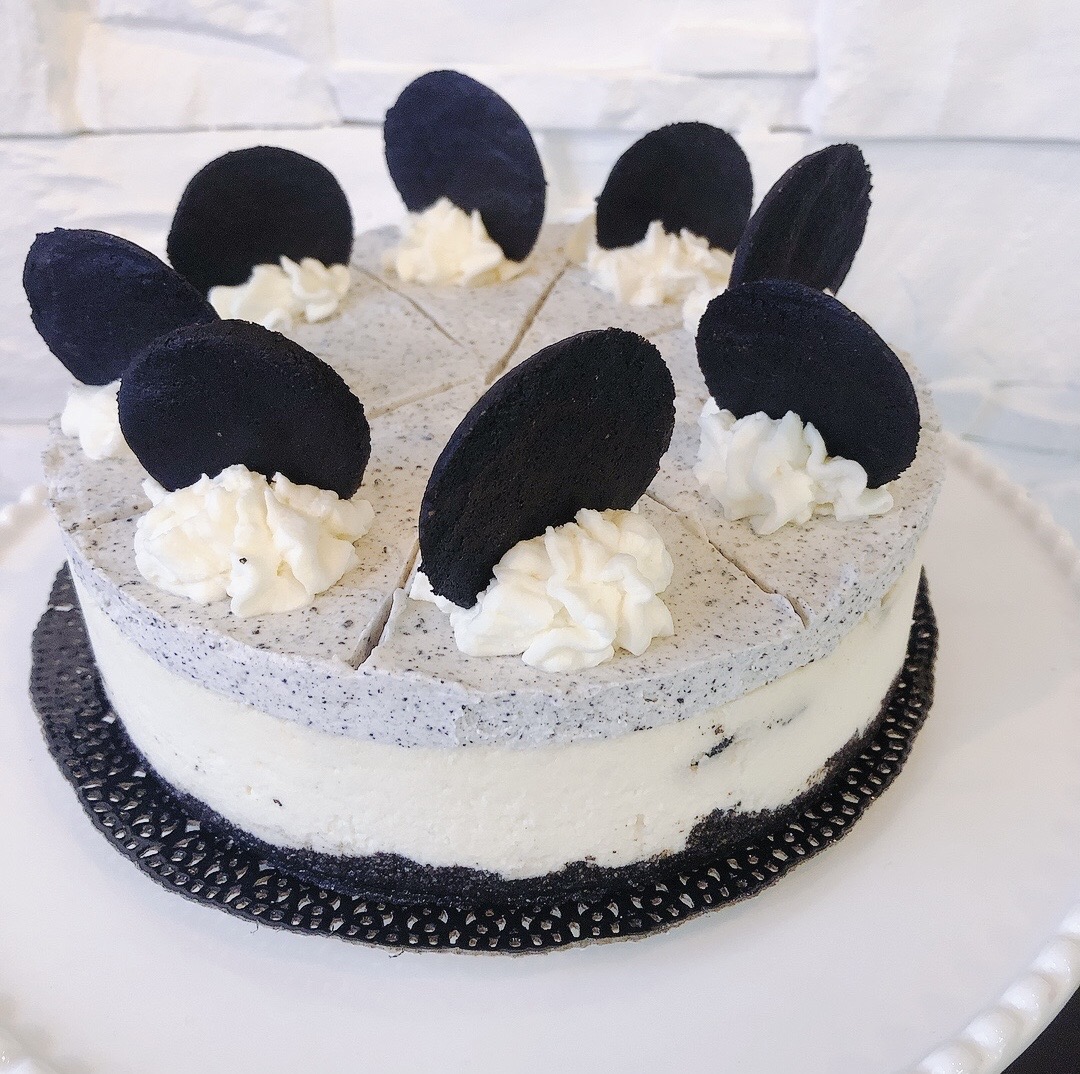 wilgotny, puszysty sernik z kruszonymi ciasteczkami oreo, na kruchym migdałowym cieście, w towarzystwie kremu oreo, z ciasteczkową dekoracją.