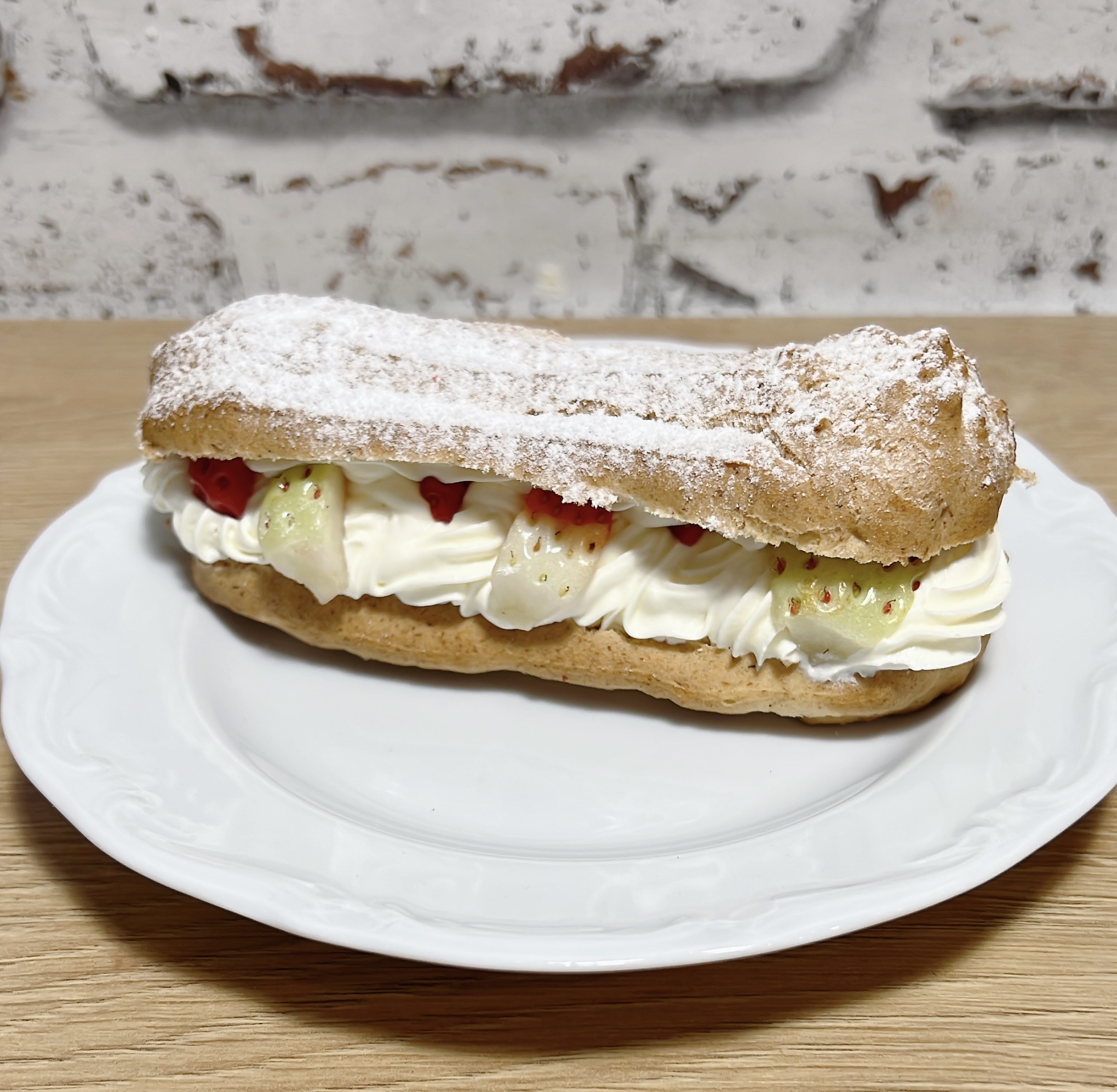 parzone ciasto ptysiowe, wypełnione śmietankowym kremem i świeżymi truskawkami w pudrowej posypce