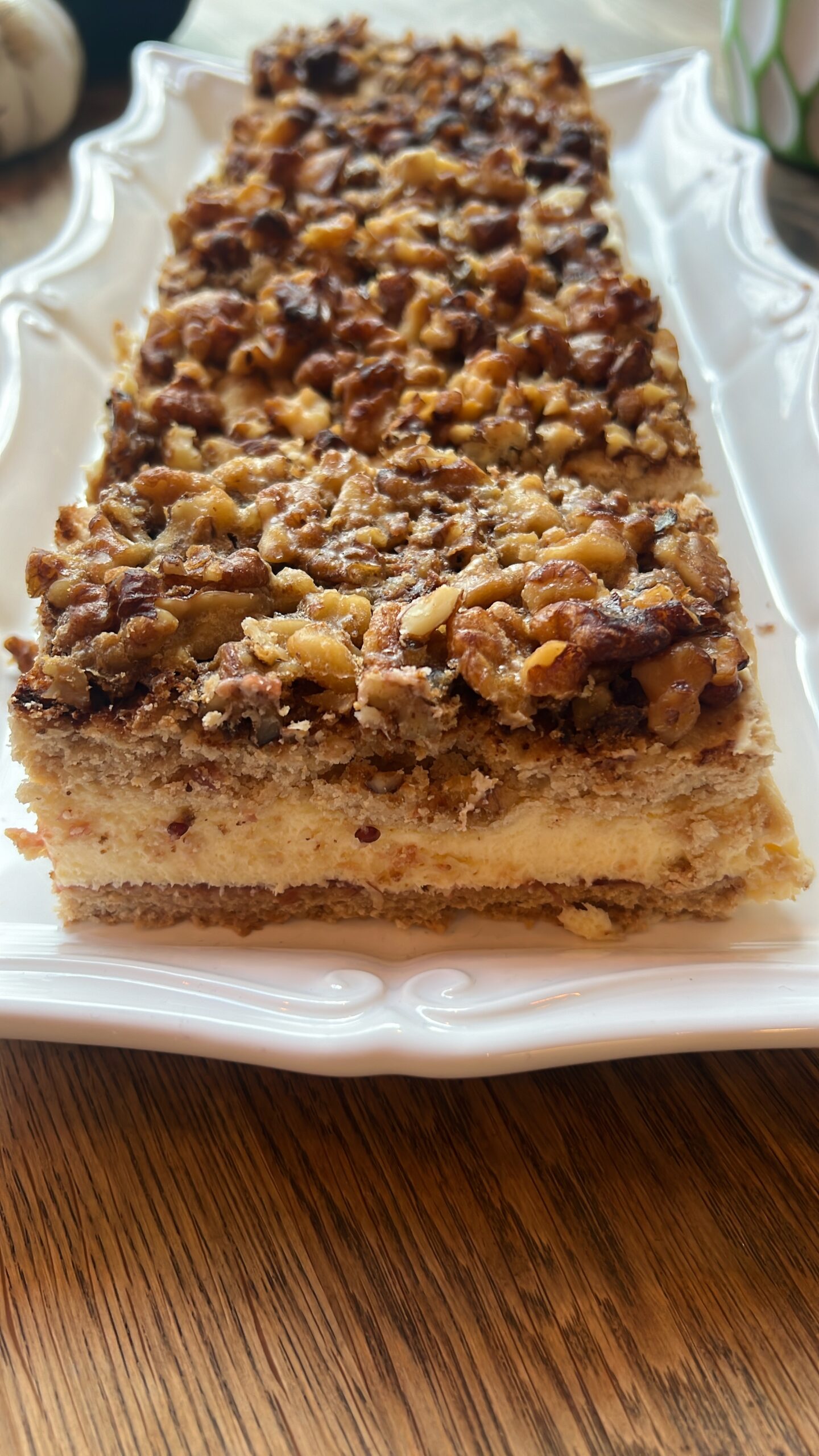 Kruche ciasto miodowe z karmelizowanymi orzechami włoskimi przełożone kremem patissiere