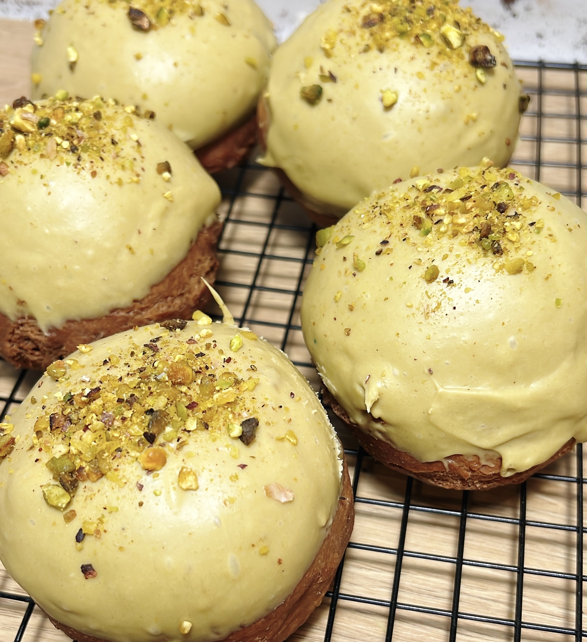 mięciutkie, puszyste pączki tradycyjnie smażone na smalcu, grubo nadziane pistacjowym kremem patisserie, w polewie pistacjowej, posypane prażonymi pistacjami