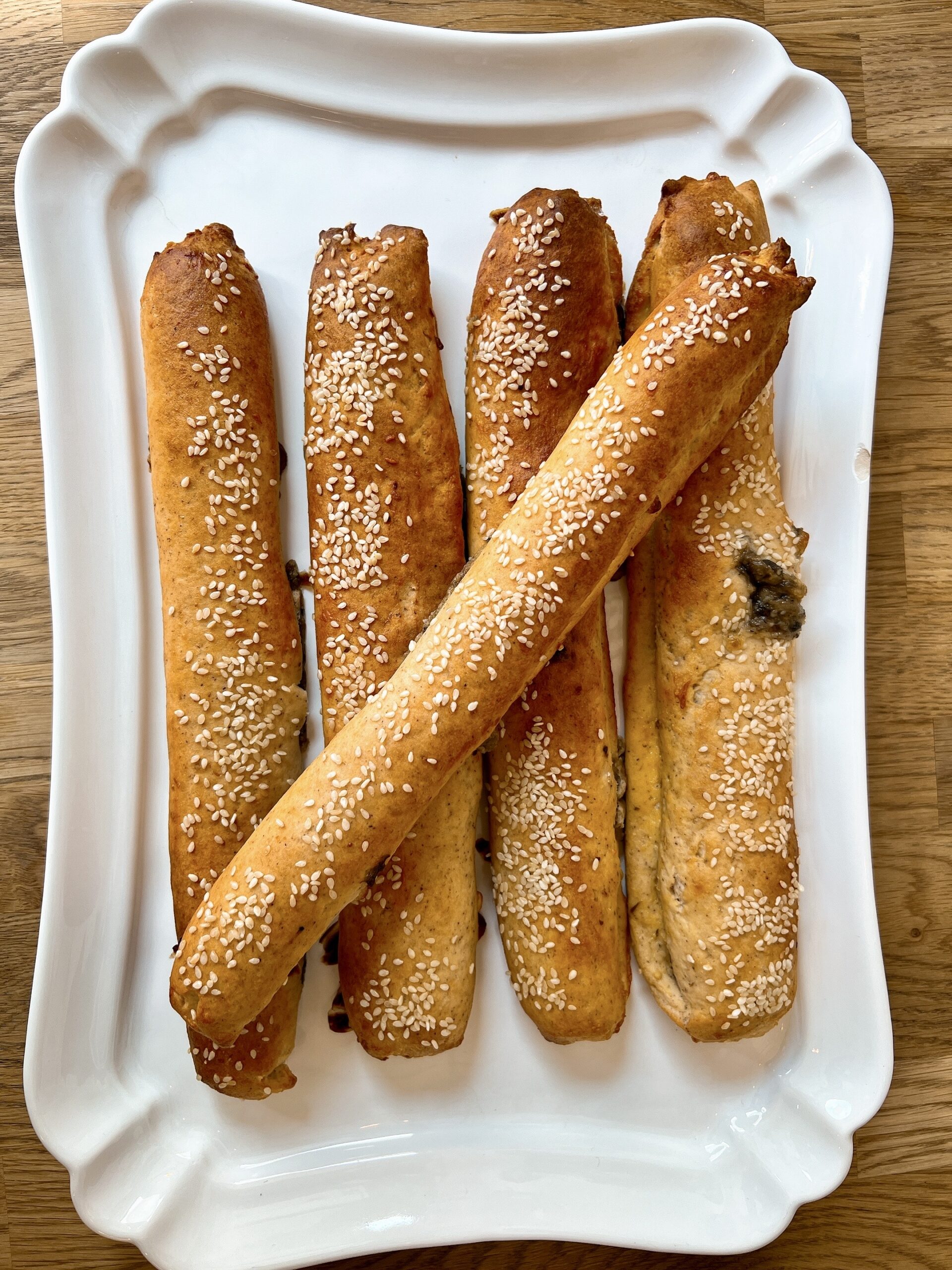 drożdżowe paluchy a la pierogi szwedzkie, nadziane farszem z pieczarek i mieszanki serów cheddar/mozzarella